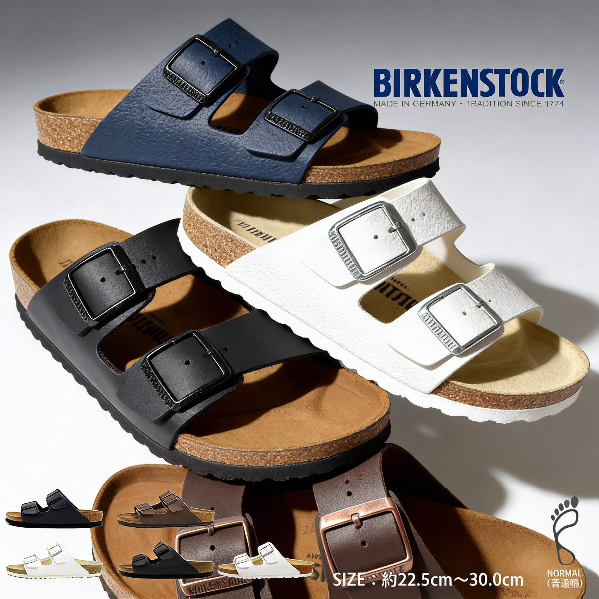 バックル部分のロゴが、『BIRKENSTOCK』となっているものと、『BIRK』となっているもの、『BIRKEN』となっているものが御座いますが、 当店ではすべて同一の商品番号で管理している為、お選び頂くことが出来ません。 予めご理解頂いた上、お買い求め下さいませ。 |